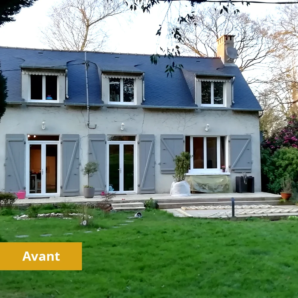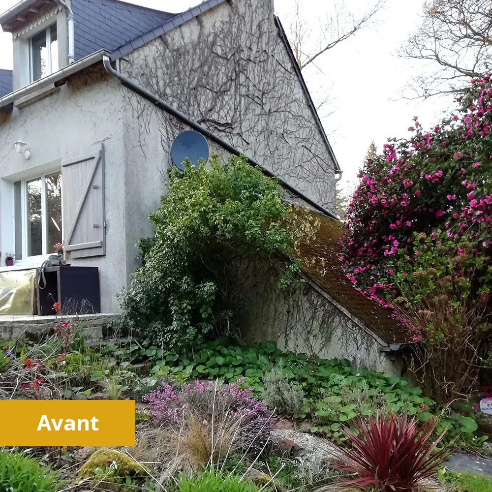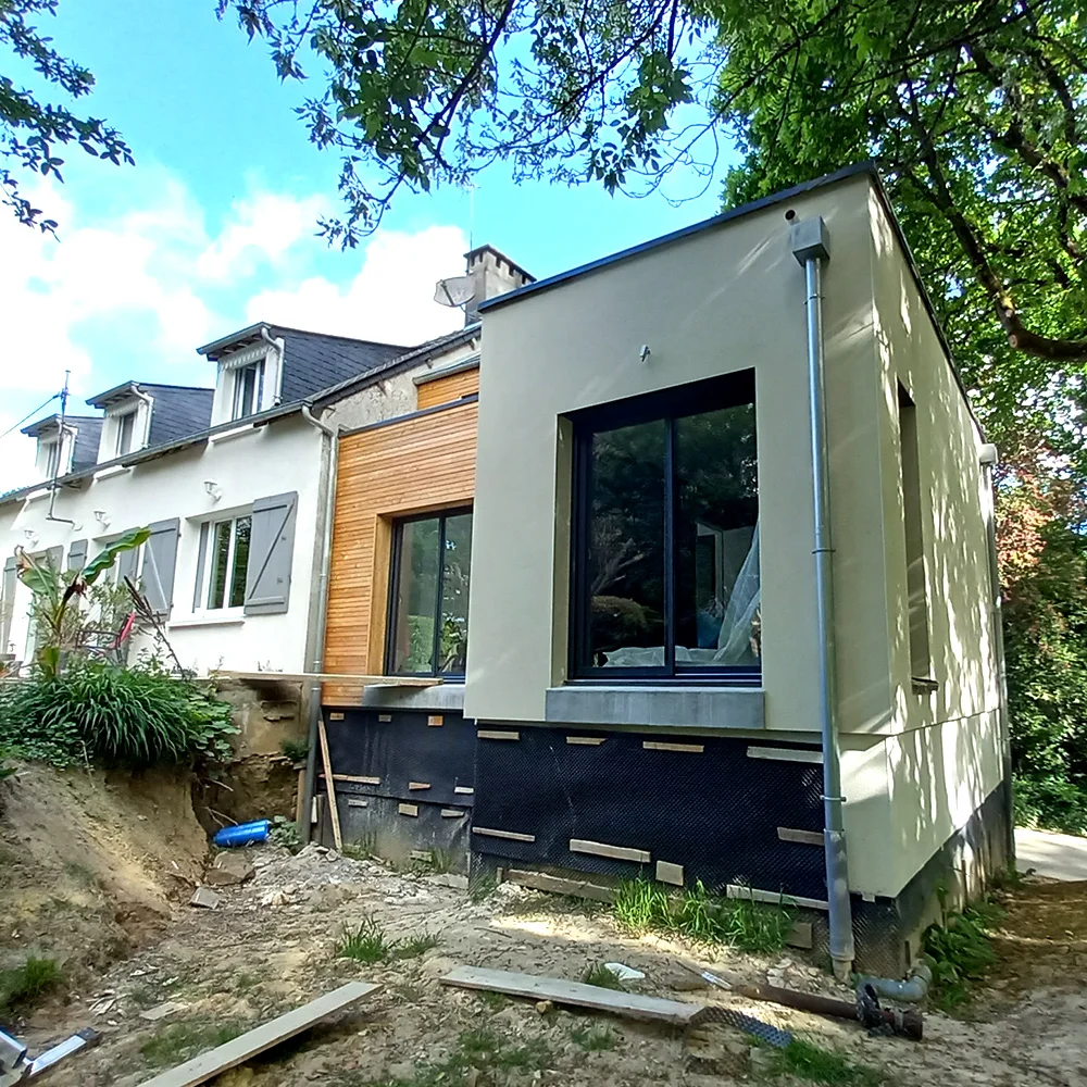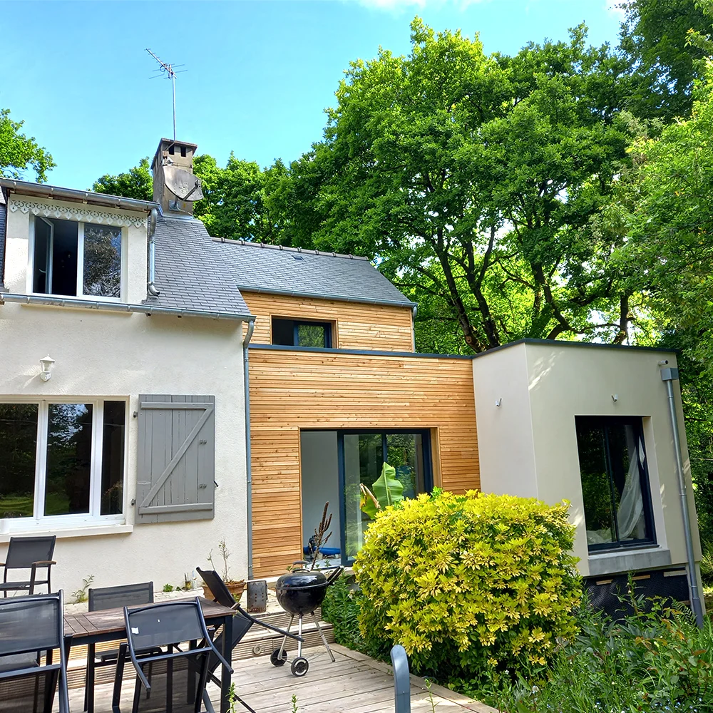 Conservation d’un vieux chêne à l’angle de l’extension : l’extension est décalée vers le sud, afin de préserver le chêne. L’extension est réalisée en ossature bois, avec un bardage bois en Douglas pour la partie transitoire et un enduit blanc pour le reste. Les menuiseries sont en aluminium gris. La toiture est en ardoise naturelle pour la partie à deux pentes et en étanchéité pour la partie toit plat.