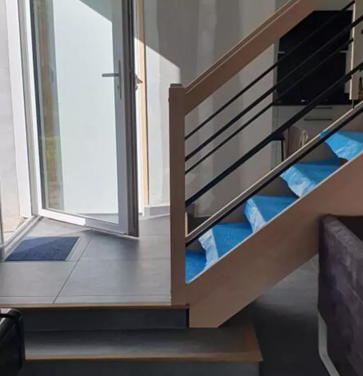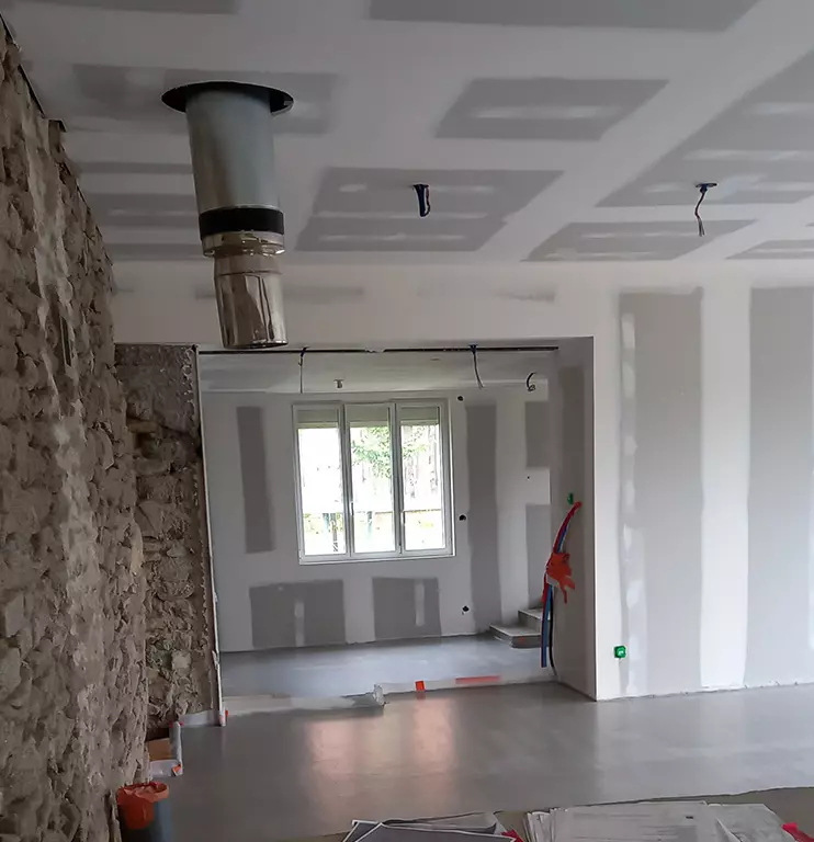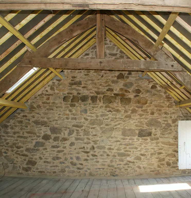 Deux lucarnes sont positionnées en rampant Sud. Cette première extension fut réalisée à l’époque en parpaing et finement isolée.
