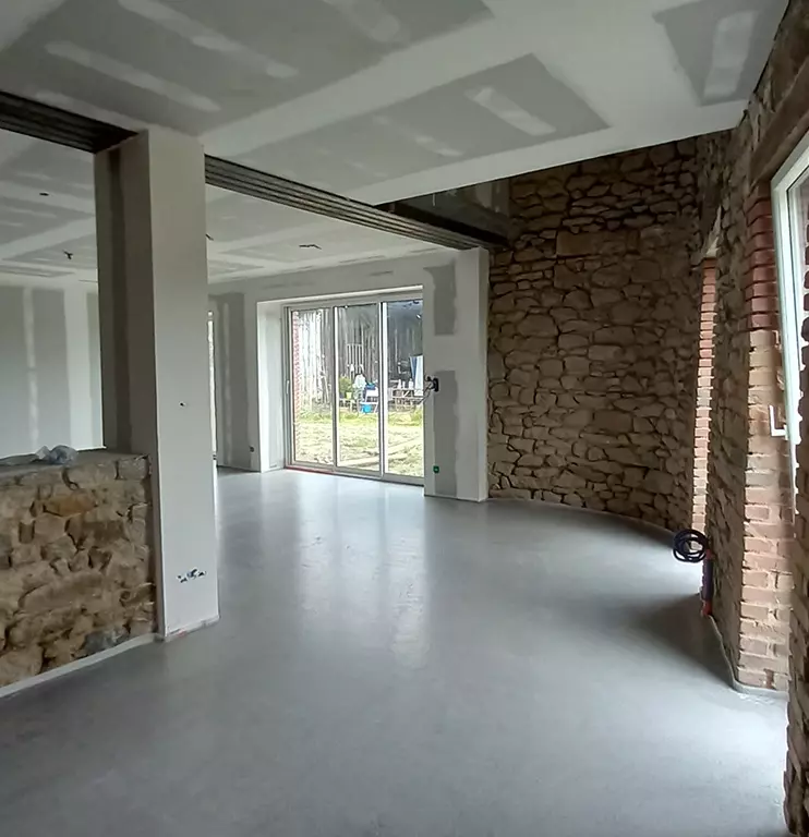Puis une deuxième extension pris sa place au Nord Ouest pour accueillir des pièces de vie également en parpaing. La toiture de la deuxième extension et de la partie agricole était en ardoise fibro, celles-ci ont été remplacées par de l’ardoise naturelle sur les deux rampants puis zinc sur la partie mono pente.