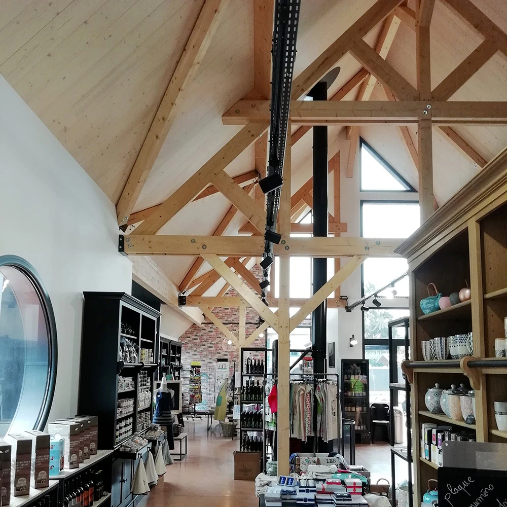 Projet d’agrandissement d’un magasin et d’une chambre froide L’ancienne maison de famille, démolie, laisse place à un bâtiment de 242 m², en ossature bois et bardage bois. L’extension de la chambre froide est construite dans la continuité de la chambre froide existante.