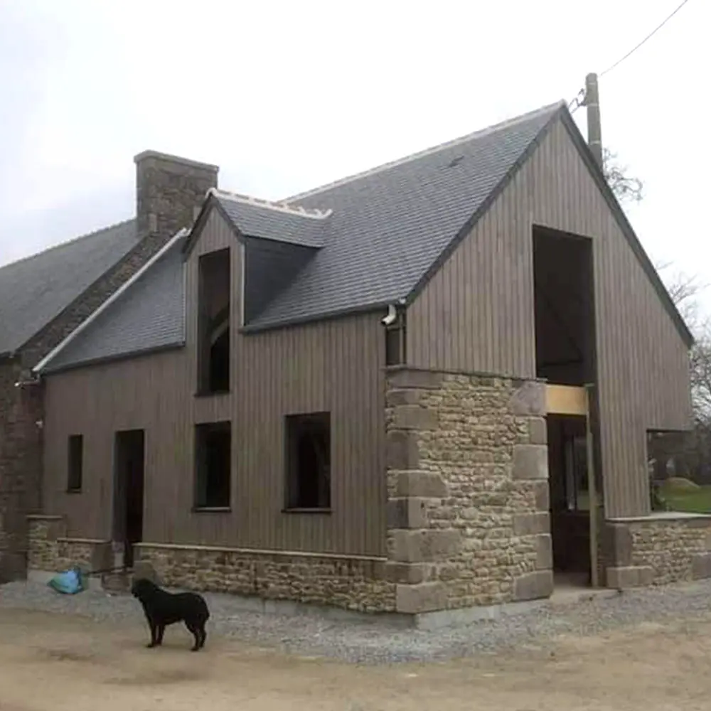 La façade Est de l’extension est ouverte sur la prairie du domaine, et est dotée d’un préau pour profiter de la vue champêtre. L’extension est en grande partie réalisée en ossature bois avec un bardage en châtaignier sur soubassement maçonné en pierre de pays.
