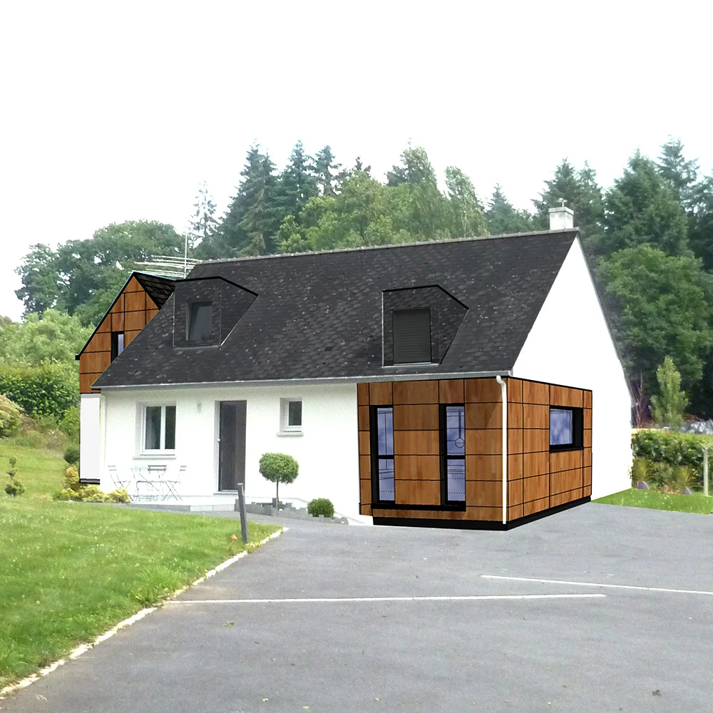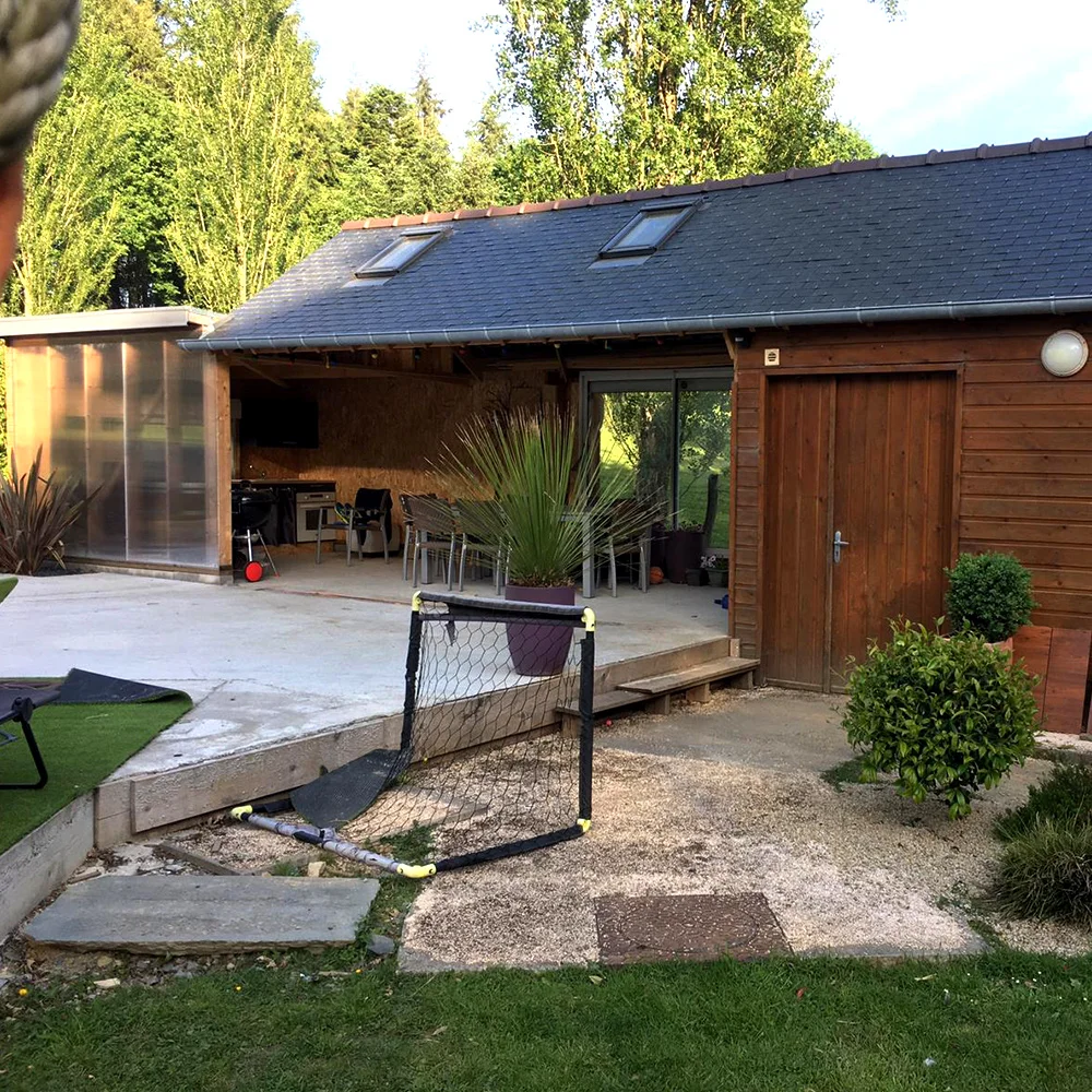 La façade Est de l’extension est ouverte sur la prairie du domaine, et est dotée d’un préau pour profiter de la vue champêtre. L’extension est en grande partie réalisée en ossature bois avec un bardage en châtaignier sur soubassement maçonné en pierre de pays.