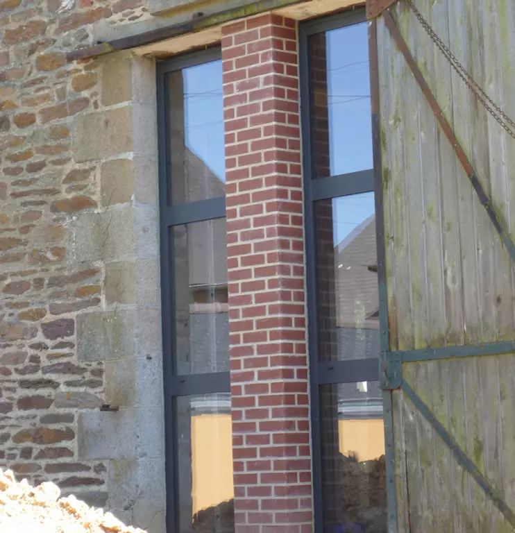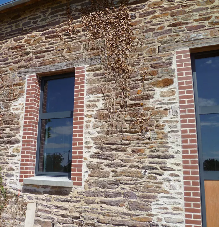 Le travail sur la brique se poursuit sur les ouvertures modifiées ou crées. Les ouvertures des pièces de vie s’ouvrent largement en façade ouest et Sud. Les ouvertures en façades Nord et Est sont conservées et modifiées dans leurs hauteurs. L’ensemble des façades est conservé en pierre. Le volume initial reste inchangé.